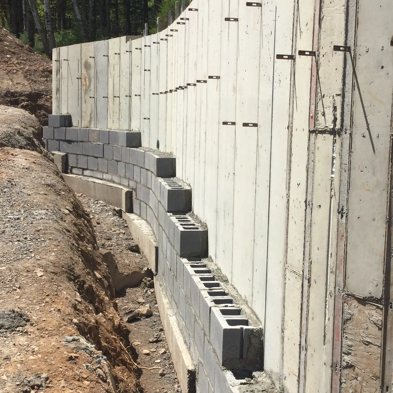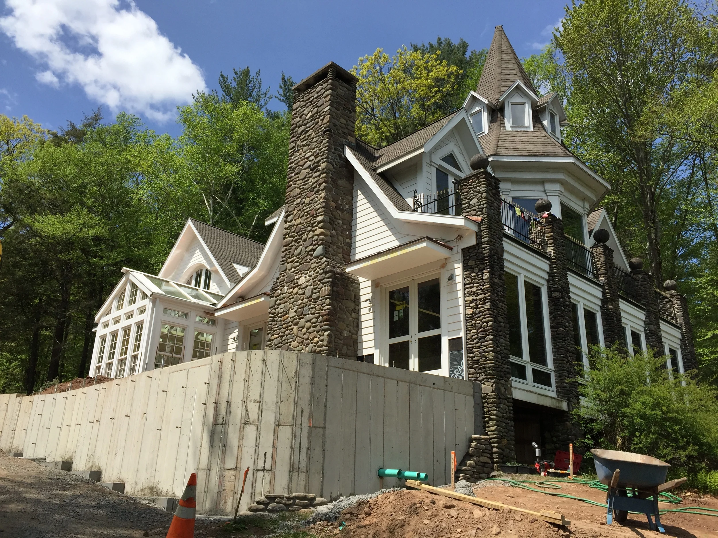 Raising the grade required a retaining wall. Since a wall comprised of small stones alone could not retain the land, an 8" reinforced cast-in-place structural concrete wall was poured on a new elongated concrete footing known as the heel of the cantilever-type retaining wall. Interestingly, though, at the patio, where the grade change was most severe, the patio slab that is tied to the wall, resists overturning and obviates the heel. In effect, the stone, serving no structural purpose, may be considered a decorative veneer - albeit a thick one.